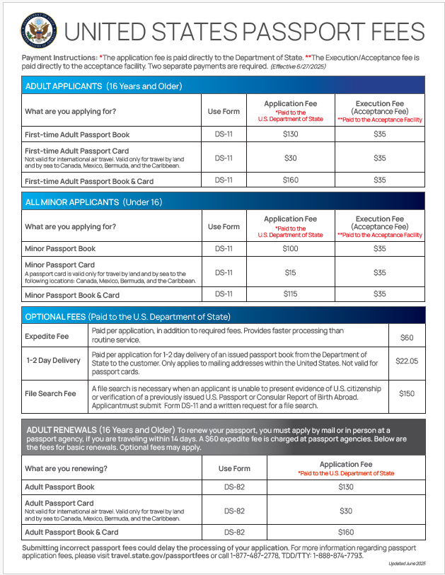 - Fees: CHECK OR MONEY ORDER ONLY for the US Department of State Fee the Clerk of Court fee can be paid by cash, check or card